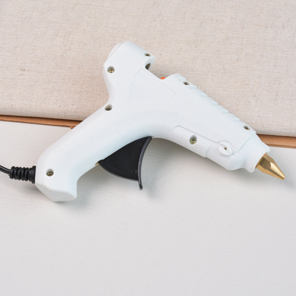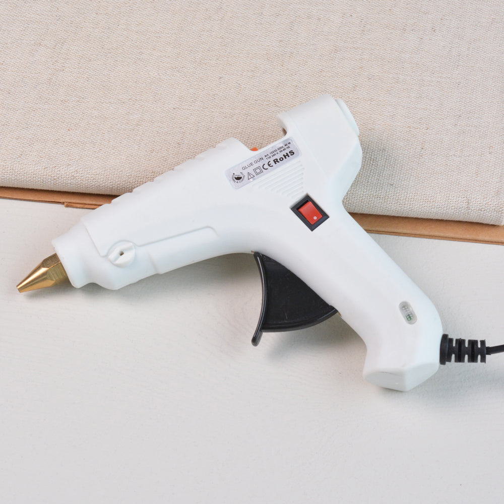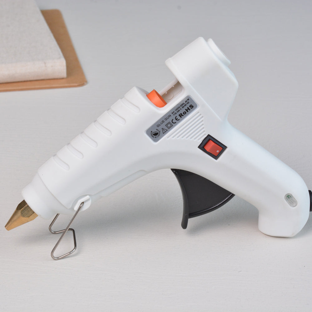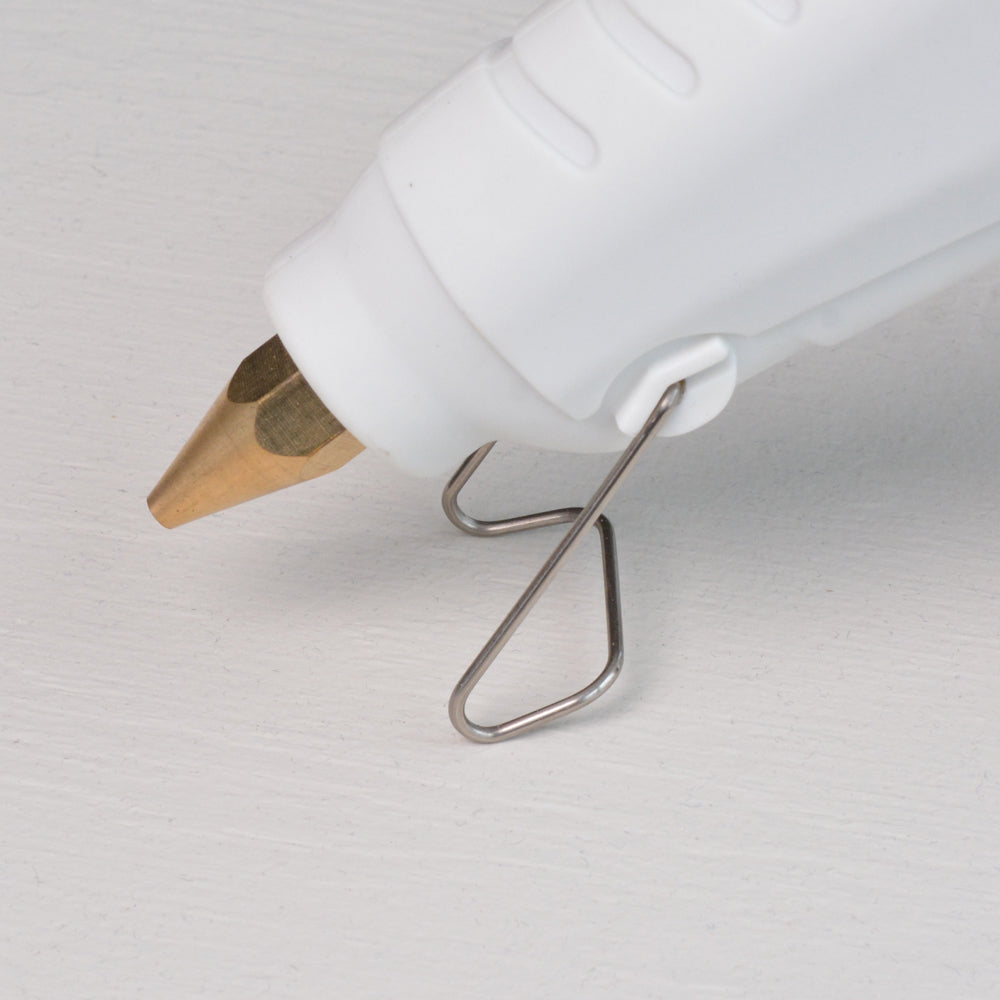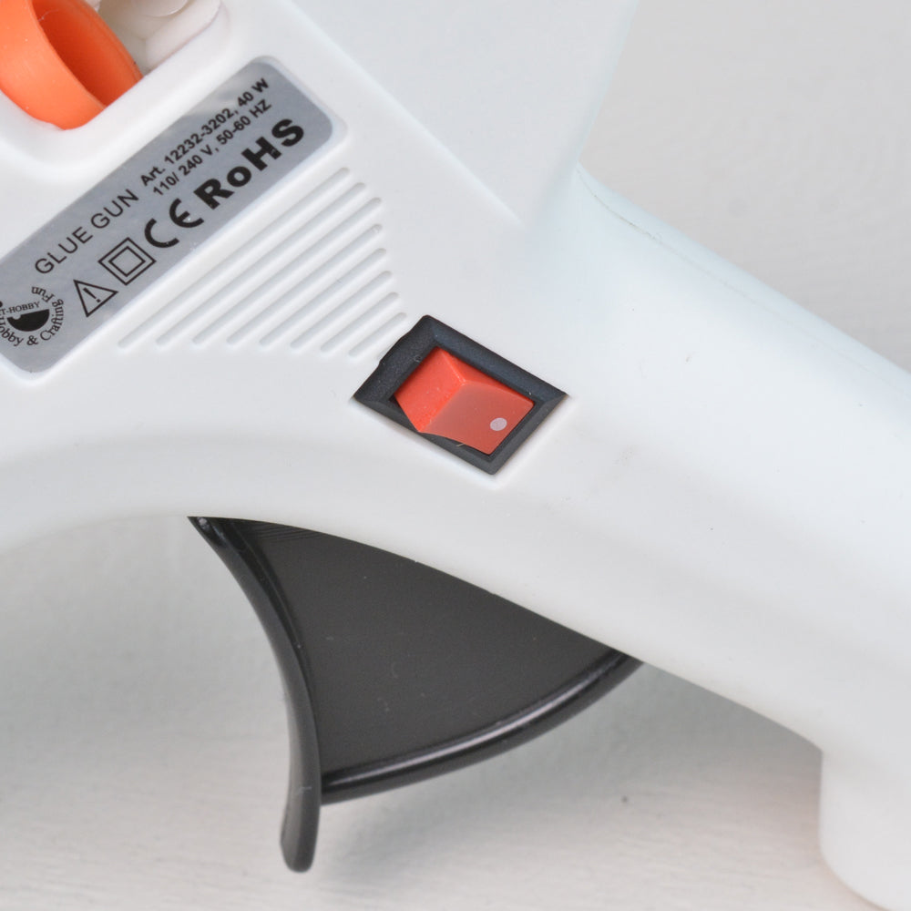 Det medfølger et metallstativ du kan feste på pistolen slik at den kan stå av seg selv. Pistolen har også en av/på-knapp for å regulere temperatur.