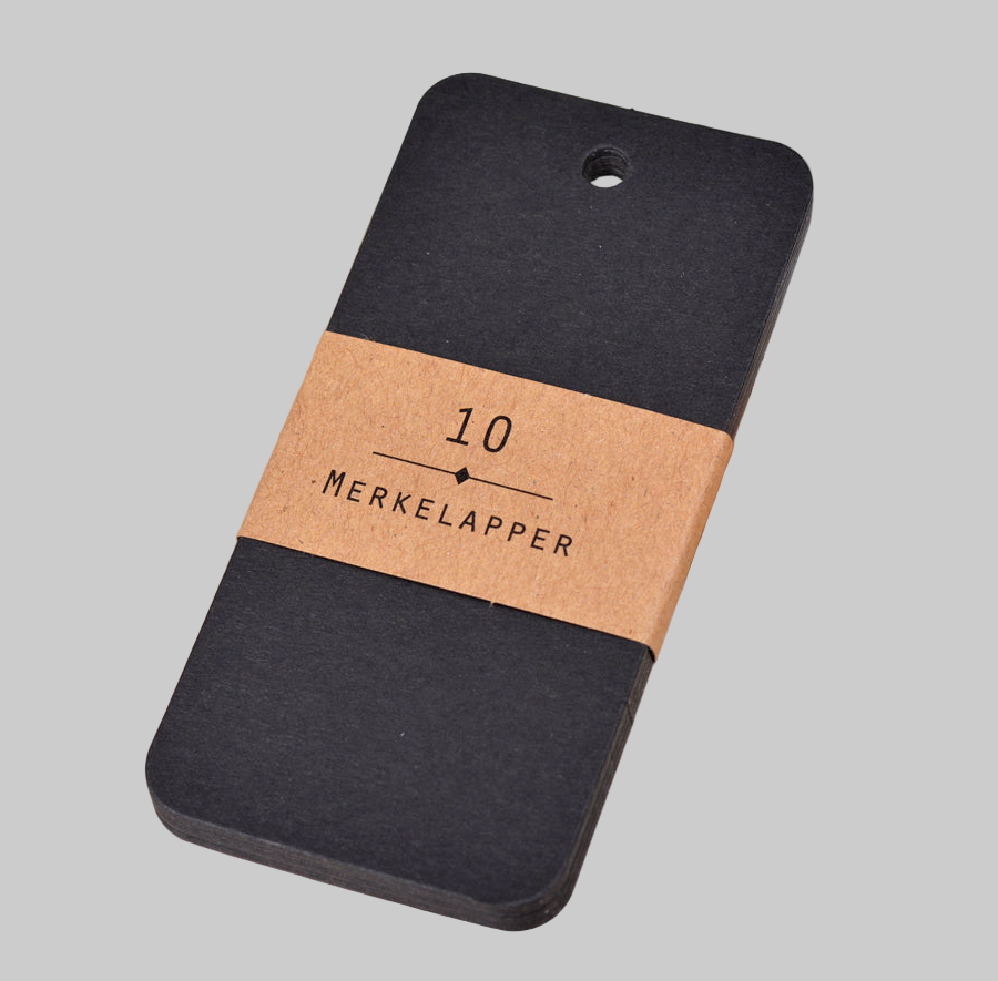 10 merkelapper med buede kanter buntet med papirbelte. Størrelsen er 4,5 x 9 cm. Merkelappene er laget av tykt 300 grams sort papir.